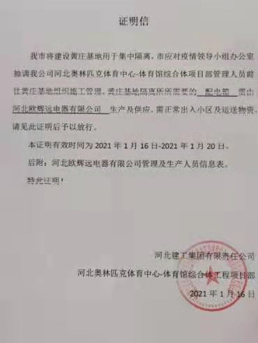 疫情的卷土重來,一夜之間,昔日人流熙攘的石家莊,瞬間安靜了下來,小區、村莊封閉,交通停止,各方志愿者們奮斗在一線,為老百姓的民生保障默默的貢獻著自己的一份力量。而我們歐輝遠人也絲毫不遜色,全力配合政府部門加入到石家莊黃莊公寓集中隔離點的建設當中,為了保證集中隔離點的順利供電,徹夜奮戰,不畏嚴寒,爭分奪秒,與疫情賽跑,彰顯人間大愛!